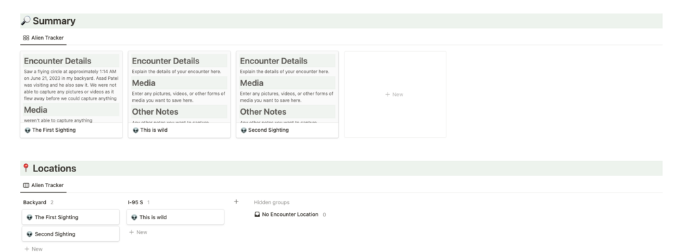 Every part of this Notion page is seamlessly integrated with each other and connected back to the Alien Encounter database.