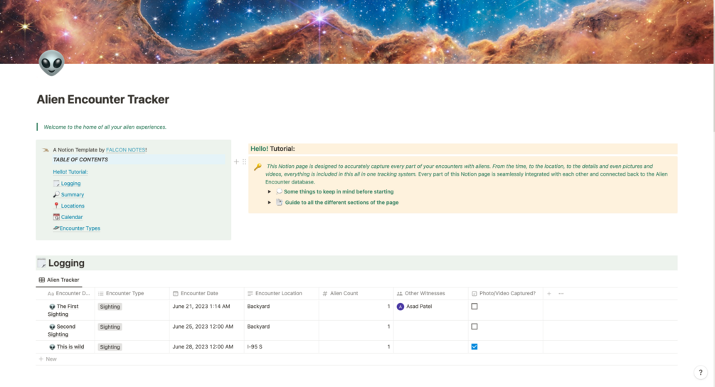 This Notion template is designed to accurately capture every part of your encounters with aliens. From the time, to the location, to the details and even pictures and videos, everything is included in this all in one tracking system.